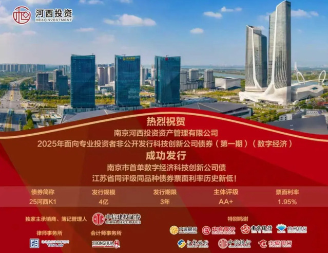 12月15日,球王会体育南京河西投资资产管理有限公司(以下简称“河西投资”)2025年面向专业投资者非公开发行科技创新公司债券(第一期)(数字经济)于上海证券交易所成功发行,系河西投资在债券市场的首次亮相。本次债券发行期限为3年,规模4亿元,利率1.95%,为江苏省同评级同品种债券票面利率历史新低。